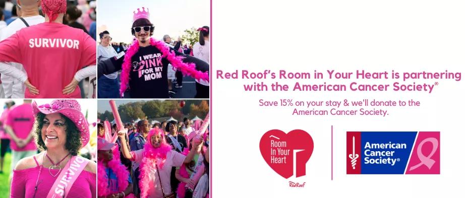 Travelers who book and stay in October can enjoy a 15% discount and help turn Red Roof pink with a portion of proceeds going to help people with cancer live longer and better lives.