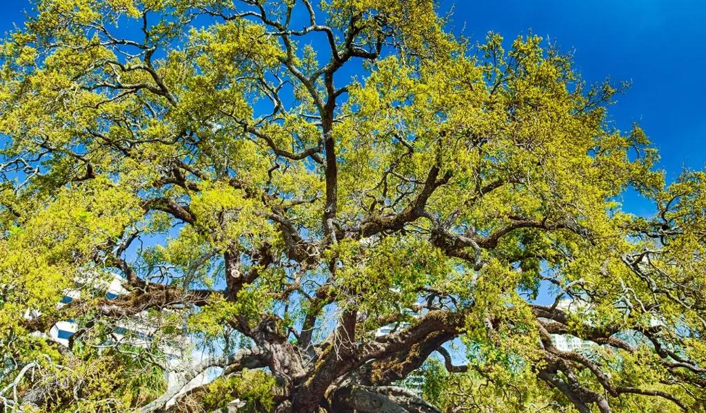 In the Southbank area of downtown Jacksonville lies the Treaty Oak. This famous tree is estimated to be 250 years old and has a trunk circumference of over 25 feet. It stands 70 feet tall and spreads out over 145 feet, with twisting branches that resemble an octopus. The Treaty Oak is a protected piece of Jacksonville's history, with cables and a lightning protection system shielding it from damage. It's estimated that the tree could live for another 400 years.
