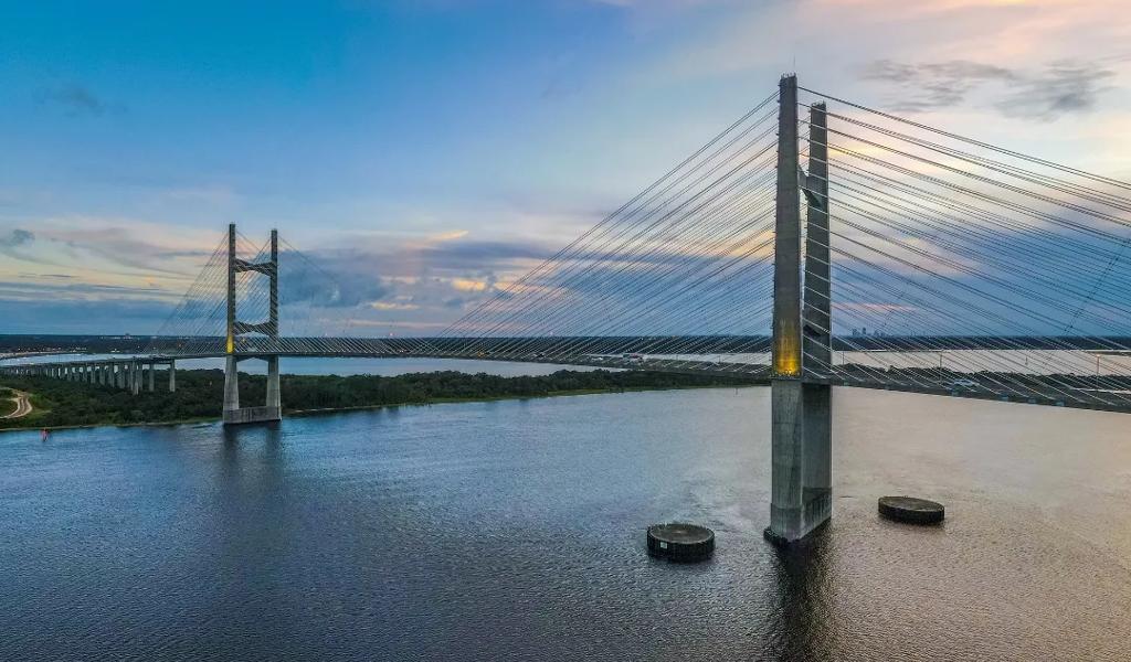 Completed in 1989, the Dames Point Bridge carries six lanes of traffic from the Arlington area to the Oceanway and Northside neighborhoods of Jacksonville. It's one of the largest cable-stayed bridges in the nation, with 21 miles of supporting cable designed on vertical planes in a harp stay arrangement.