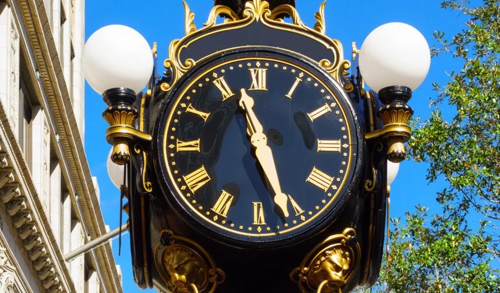 The clock is covered in ornate details, including intricate ironwork, a green patina, decorative motifs, and a turn-of-the-century base design. Capture a memorable photo at the golden hour when the light hits just right.